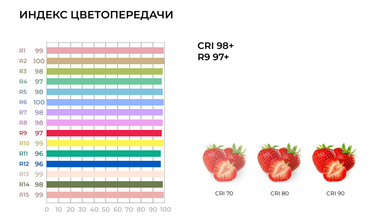 Значение CRI варьируется от 0 до 100: чем выше индекс, тем лучше цветопередача. Максимальный индекс цветопередачи у солнца (эталон) — 100.