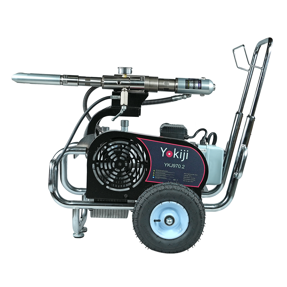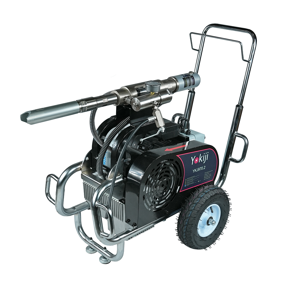 YOKIJI YKJ 970.2 – гидропоршневой безвоздушный электрический окрасочный аппарат. Он может применяться для распыления материалов с высокой, средней и низкой вязкости: красок, эмалей, шпаклевок, огнезащитных, гидроизоляционных, антикоррозийных и цинконаполненных составов, мастик, грунтовок. Аппарат используется на стройплощадка при отделке помещений, зданий и сооружений, а также на производствах при покраске больших конструкций. Модель работает от розетки 220B и обладает высокой производительностью (10 л/мин); позволяет присоединять до 3 малярных постов и подавать материал на высоту до 90 метров.