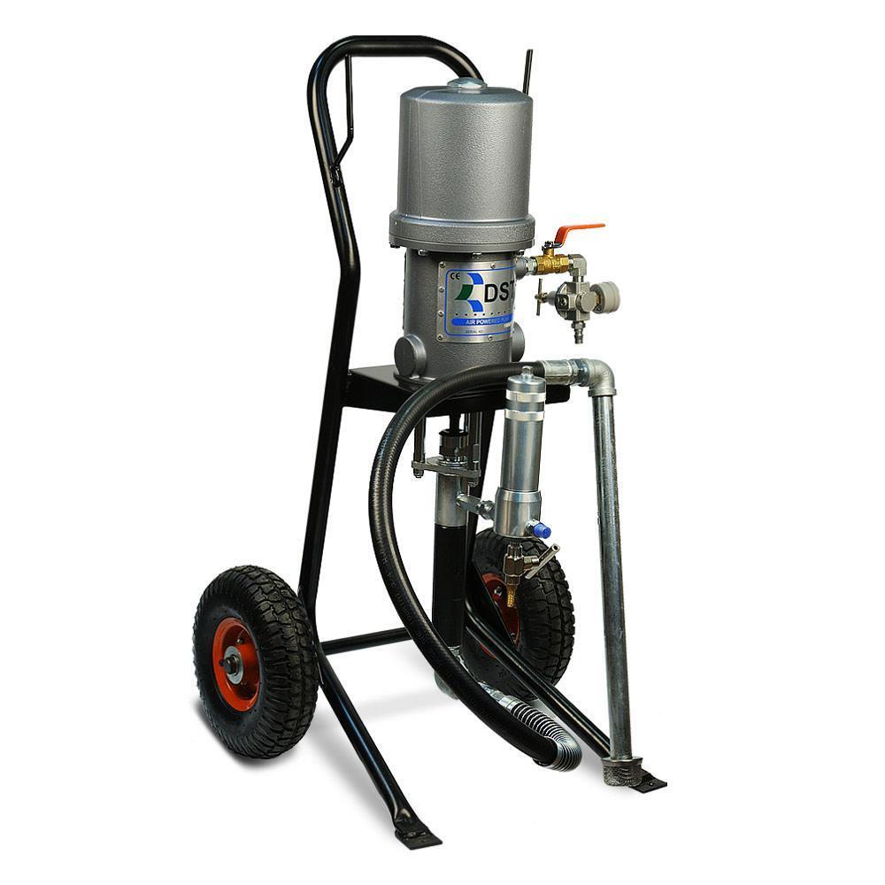 В окрасочный аппарат поступает воздух от компрессора или пневматической сети, (для работы аппарата требуется от 2-8 бар, 700 л/мин воздуха). Краска в аппарат засасывается из ведра, в котором та поставляется, на входе во всасывающий патрубок надет фильтр от грубых примесей в краску. За счет разницы площадей верхней и нижней части насоса в 30 раз (передаточное соотношение 30:1) нагнетается давление на краску, т.е подавая 2 атм воздуха , мы получаем 60 атм краски, 3 атм воздуха - 90 атм краски, и тд. Краска на выходе из аппарата фильтруется через фильтр тонкой очистки и попадает в шланг для подачи на краскопульт. Краска на выходе из краскопульта распыляется через сопло тонкого сечения, образуя при этом четко очерченный факел.